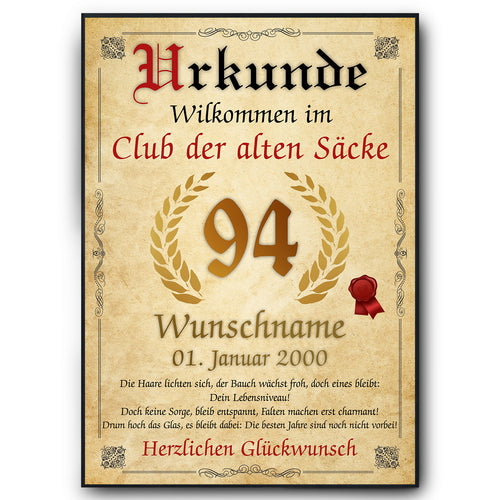 94. Geburtstag Urkunde personalisiert ALTER SACK Geschenk Mann Club der alten Säcke Geburtstagskarte Deko Bild