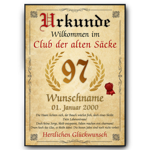 97. Geburtstag Urkunde personalisiert ALTER SACK Geschenk Mann Club der alten Säcke Geburtstagskarte Deko Bild