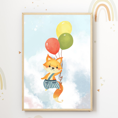 Fuchs Luftballon Kinderzimmer Bild DIN A4 Poster Babyzimmer Wandbild Dekoration