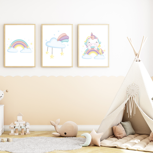 Einhorn Regenbogen Wolke 3er Set Kinderzimmer Bilder DIN A4 Poster Babyzimmer Wandbilder Dekoration