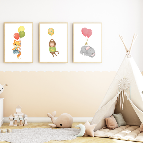 Luftballon Tiere 3er Set Kinderzimmer Bilder DIN A4 Poster Babyzimmer Wandbilder Dekoration - Fuchs Affe Elefant