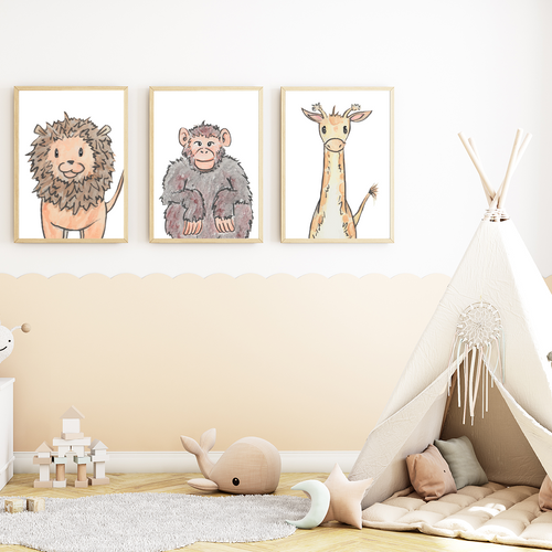 Safari Tiere 3er Set Kinderzimmer Bilder DIN A4 Poster Babyzimmer Wandbilder Dekoration - Löwe Affe Giraffe
