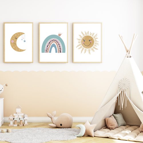 Mond Regenbogen Sonne 3er Set Kinderzimmer Bilder DIN A4 Poster Babyzimmer Wandbilder Dekoration