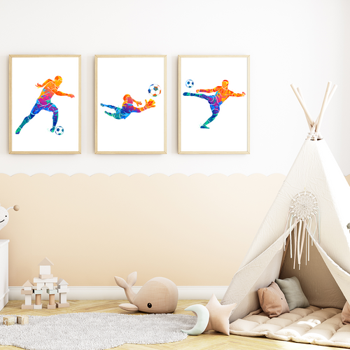 Farbenfrohe Fußballspieler 3er Set Kinderzimmer Fußball Bilder DIN A4 Poster Babyzimmer Wandbilder Dekoration
