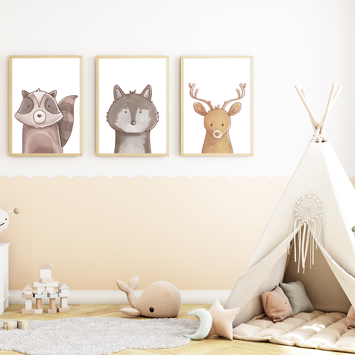 Waldtiere Waschbär Wolf Reh 3er Set Kinderzimmer Bilder DIN A4 Poster Babyzimmer Wandbilder Dekoration