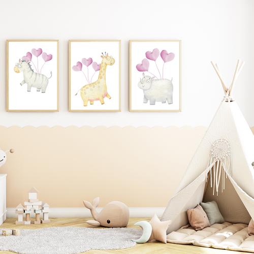 Luftballon Tiere 3er Set Kinderzimmer Bilder DIN A4 Poster Babyzimmer Wandbilder Dekoration - Esel Giraffe Nashorn