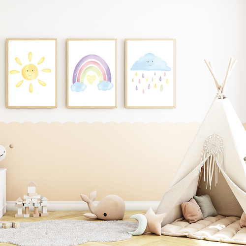Pastell Sonne Regenbogen Wolke 3er Set Kinderzimmer Bilder DIN A4 Poster Babyzimmer Wandbilder Dekoration