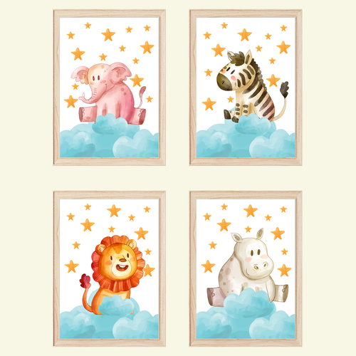 Elefant Zebra Löwe Nilpferd Sterne Wolken 4er Set Kinderzimmer Bilder DIN A4 Poster Babyzimmer Wandbilder Dekoration