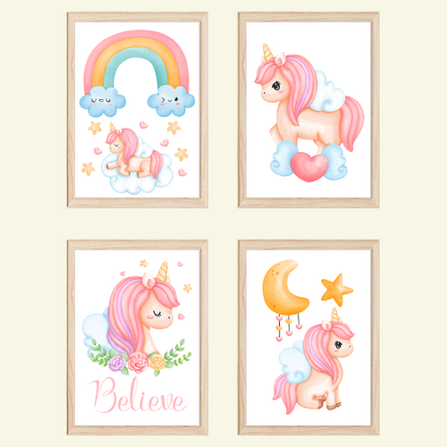 Einhorn Regenbogen 4er Set Kinderzimmer Bilder DIN A4 Poster Babyzimmer Wandbilder Dekoration