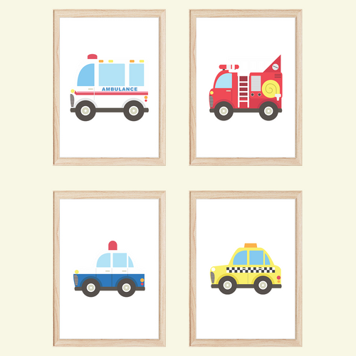Krankenwagen Feuerwehr Polizei Taxi Autos 4er Set Kinderzimmer Bilder DIN A4 Poster Babyzimmer Wandbilder Dekoration