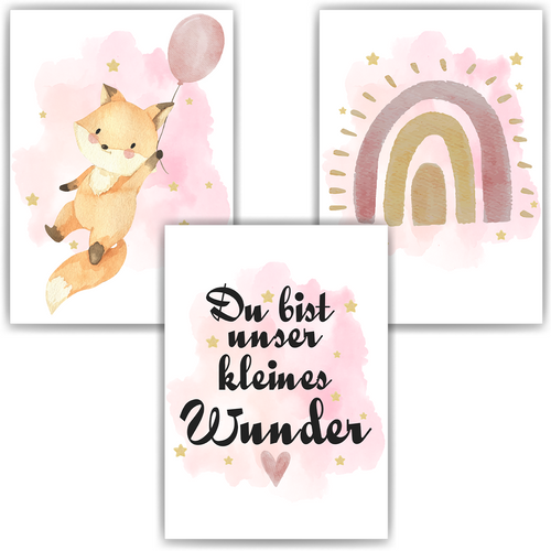 Kleines Wunder Fuchs Regenbogen Luftballon Bilder 3er Set DIN A4 Kinderzimmer Wandbilder Babyzimmer Poster Dekoration