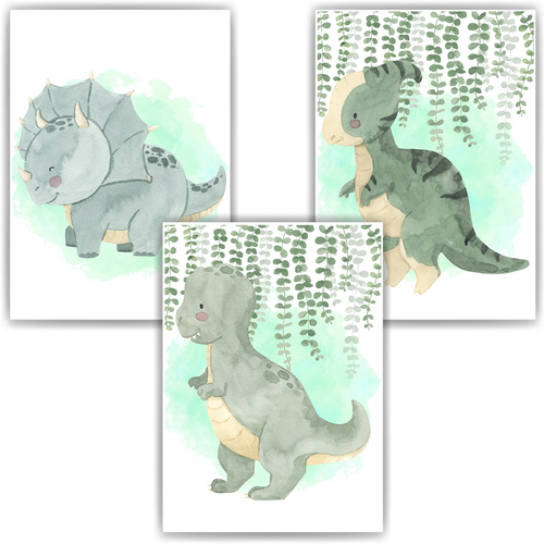 Niedliche Dinosaurier Bilder 3er Set DIN A4 Kinderzimmer Dino Wandbilder Babyzimmer Poster Dekoration