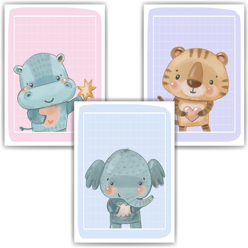Süße Tiere 3er Set DIN A4 Kinderzimmer Wandbilder Babyzimmer Poster Dekoration Nilpferd Elefant Tiger