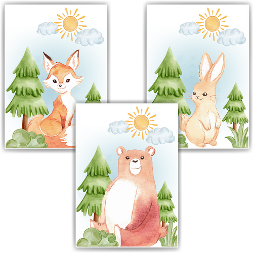 Waldtiere Fuchs Eichhörnchen Bär Hase Bilder 3er Set DIN A4 Kinderzimmer Wandbilder Babyzimmer Poster Dekoration