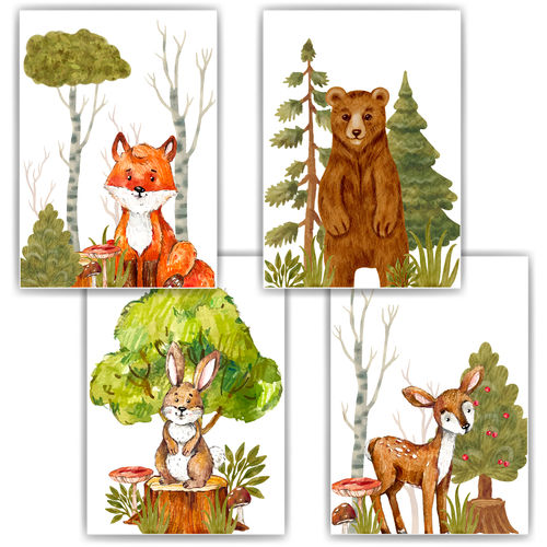 Niedliche Waldtiere Bilder 4er Set DIN A4 Kinderzimmer Wandbilder Babyzimmer Poster Dekoration - Reh Fuchs Bär Hase