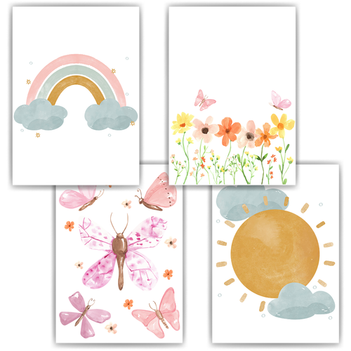 Regenbogen Sonne Schmetterlinge Bilder 4er Set DIN A4 Kinderzimmer Wandbilder Babyzimmer Poster Dekoration